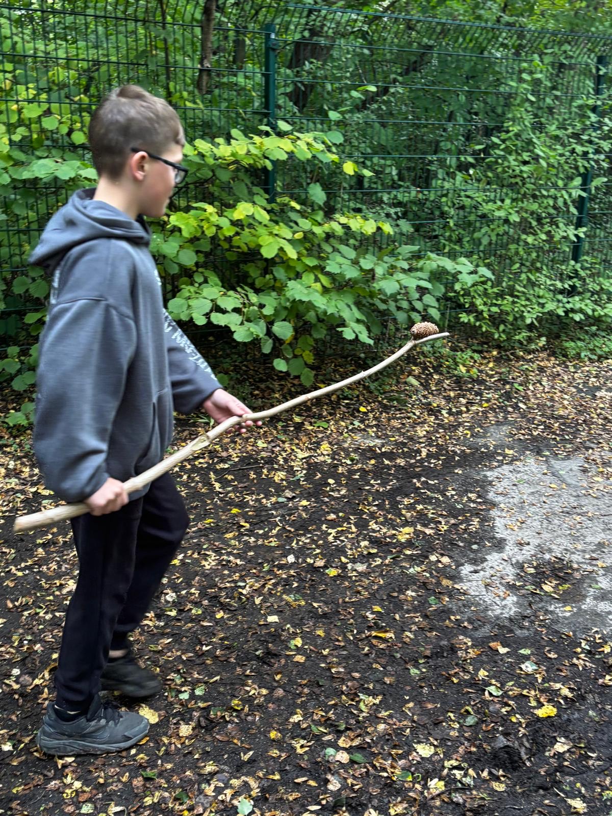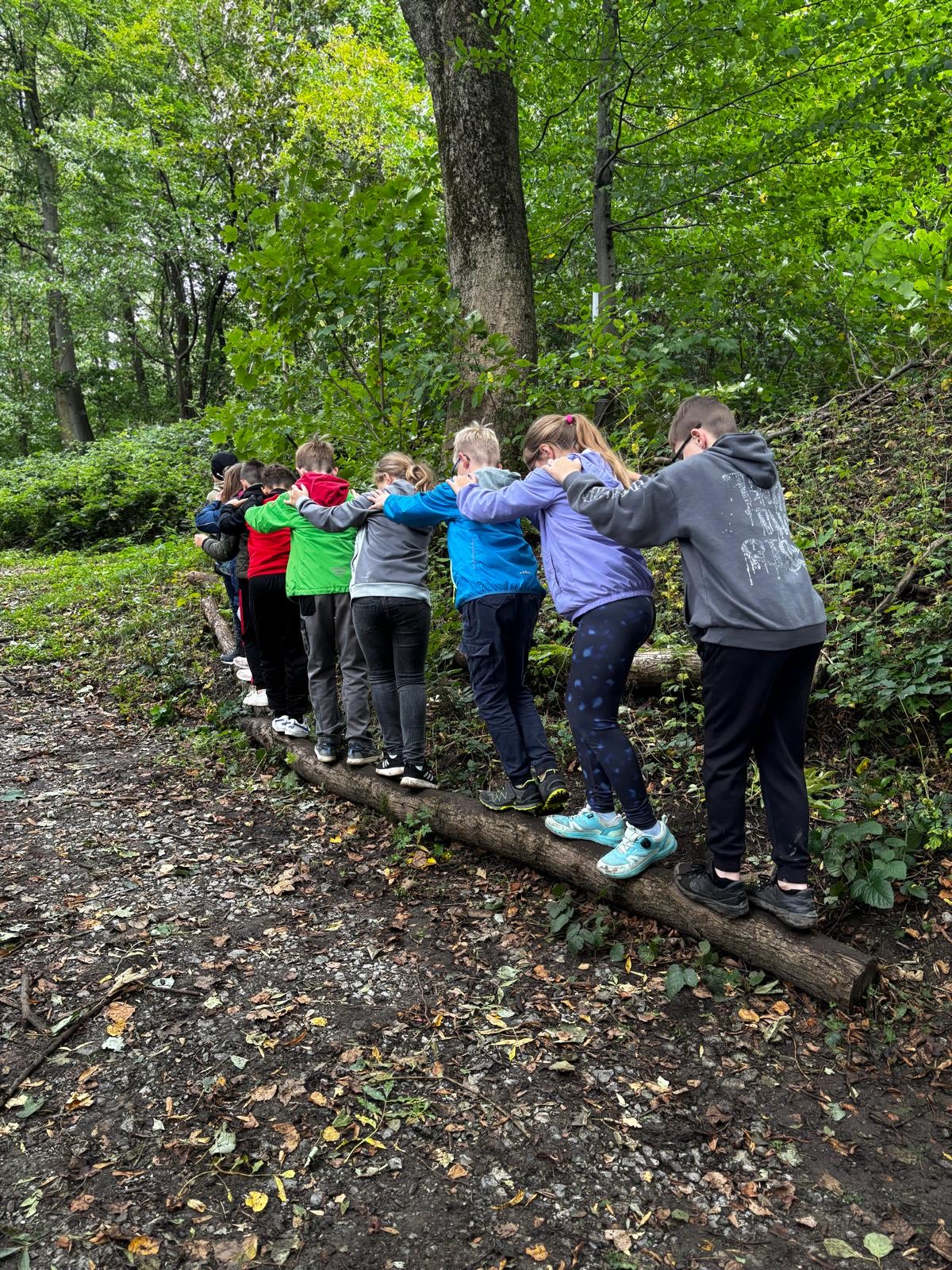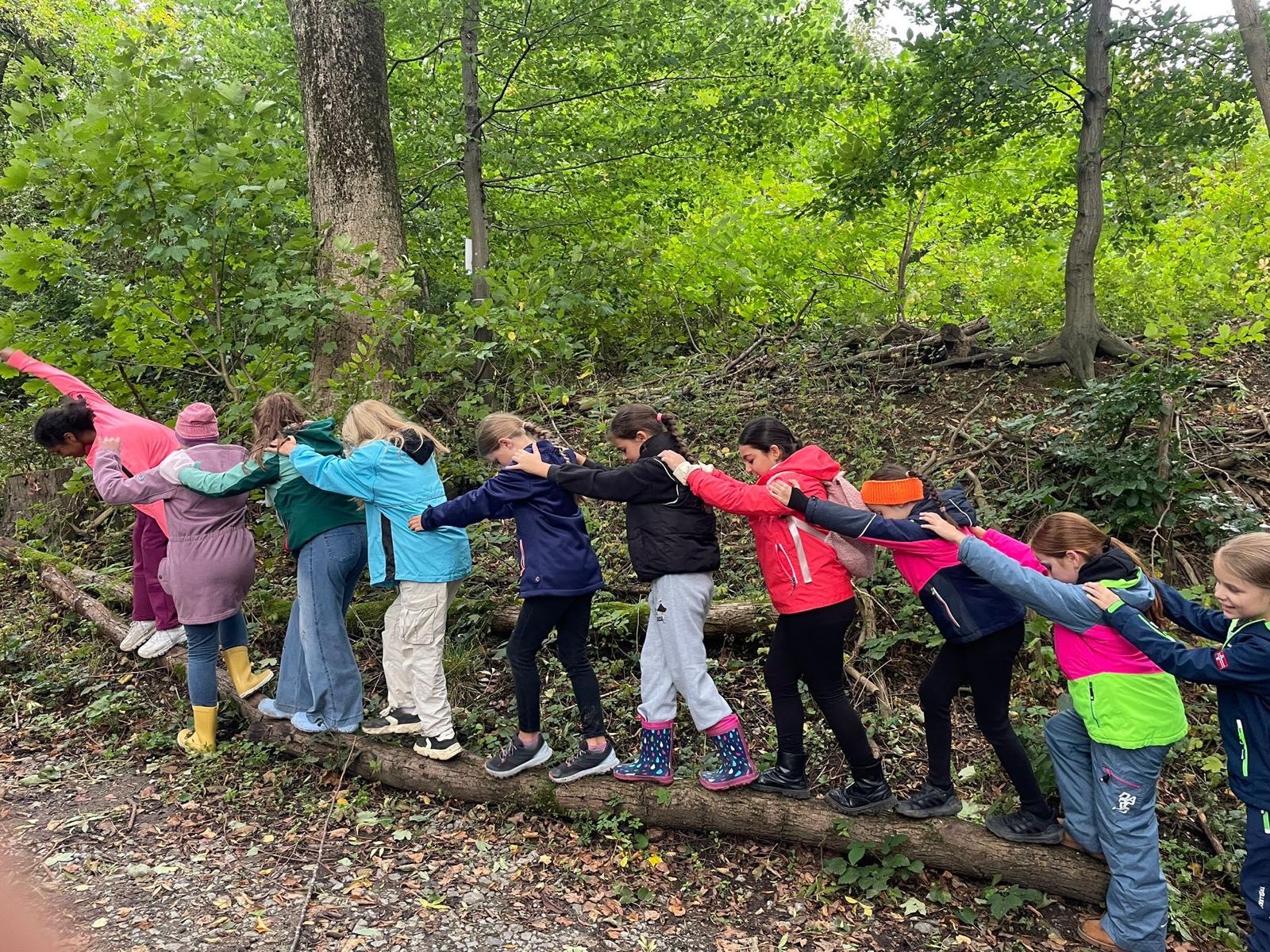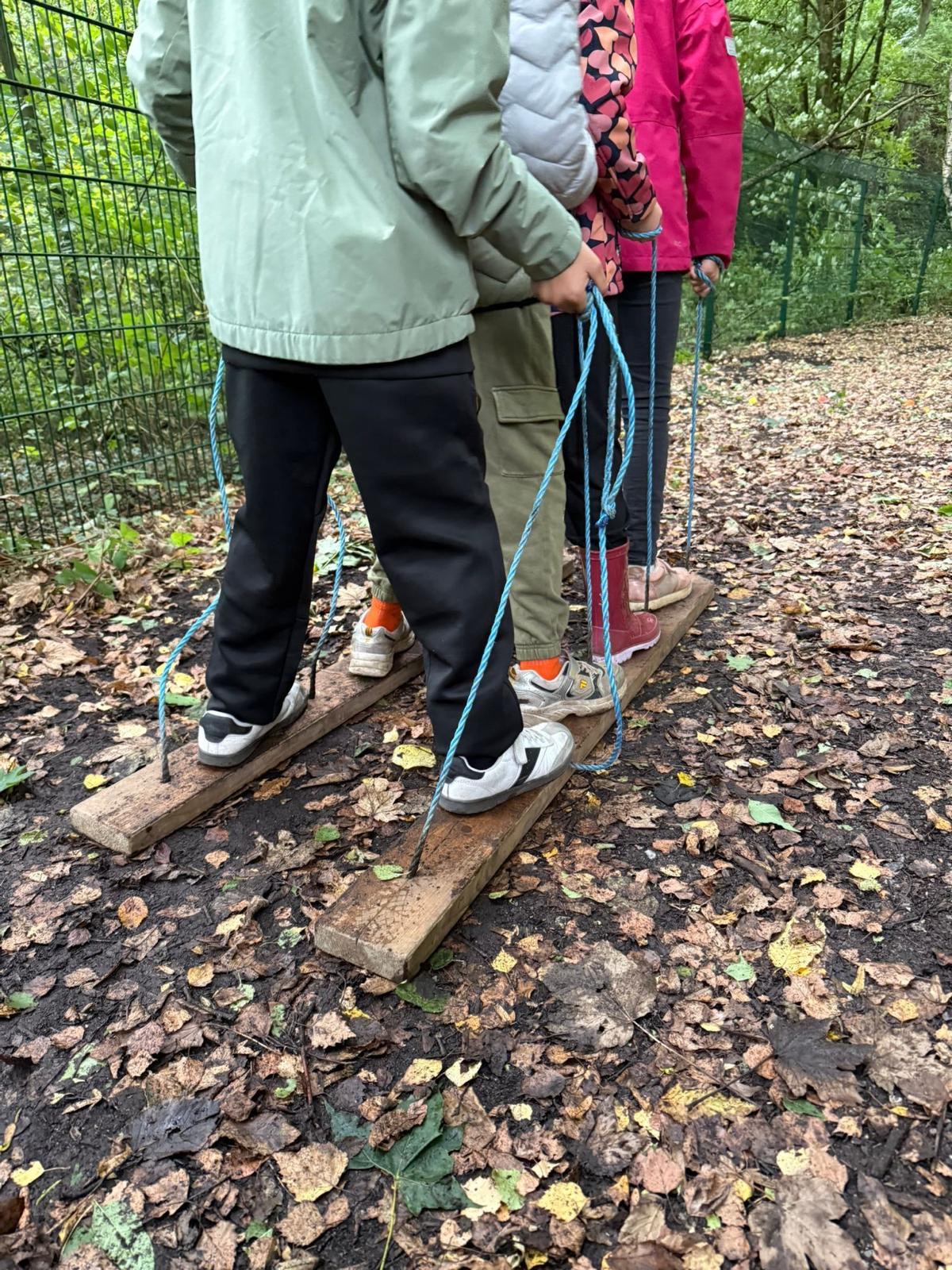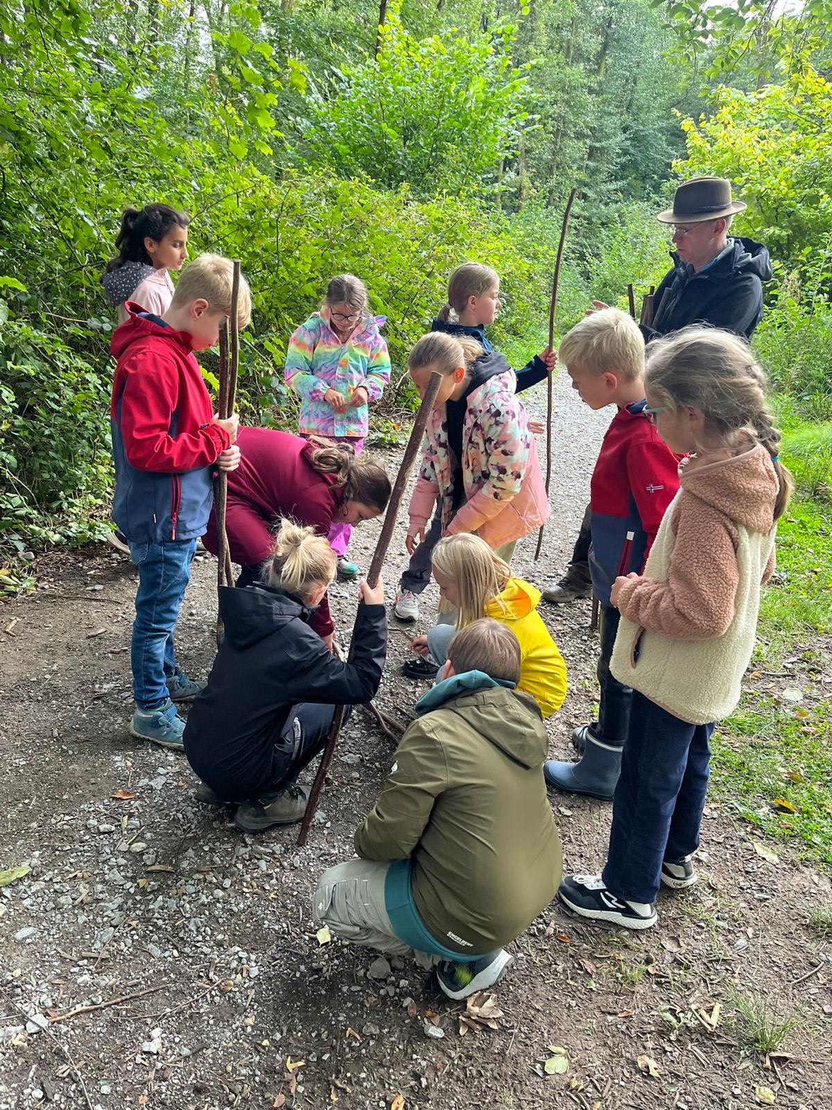 Der Jahrgang 4 der Parkschule hat heute das Klassenzimmer gegen den Lernort Natur getauscht. In drei Gruppen haben sich die Vierer auf den Weg in Richtung Zeittunnel gemacht. Da angekommen, wurden sie vom zuständigen Jäger begrüßt und mit einem Aufgabenzettel und guten Wünschen in den Wald geschickt. Dort galt es, an verschiedenen Stationen Teamgeist zu zeigen, Geschicklichkeit zu demonstrieren, oder mit Waldwissen zu punkten. Mit etwas mulmigem Gefühl wurde z.B. ein leeres Schneckenhaus in der Fühlkiste ertastet. Beim Wiesenski musste zusammengearbeitet werden, damit sich die Holzbretter, auf denen vier Kinder gleichzeitig standen, im Takt vorwärts bewegen ließen. Das Balancieren von Tannenzapfen auf einer Astgabel erwies sich als gar nicht so leicht. Dafür fielen die Holzstecken beim Waldmikado sehr schön, das hat die Spieler gefreut. Zusammenarbeit war auch bei den Wissensfragen wichtig, das eine Kind wusste, dass man aus Brennnesseln Salat machen kann, ein anderes hatte schon von Brennnesselsuppe gehört. Nach halber Strecke hatten sich die Kinder eine Pause verdient. Die Aufgabe, zwei Minuten ganz still in den Wald hineinzuhorchen, schafften die Kinder prima, erstaunlich, was die Natur alles an Geräuschen zu bieten hat.
