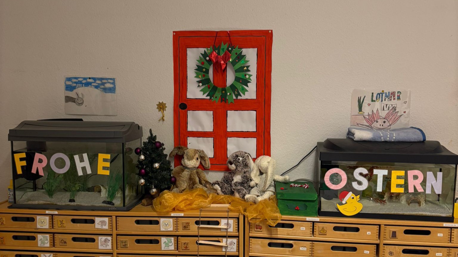 Nachdem unser geheimnisvoller Besucher sich in einem Brief an die Kinder zu erkennen gegeben hat, war es klar: In der OGATA ist ein echter Weihnachtswichtel mit dem Namen Parki Ogati eingezogen! Er hat es in der ersten Dezemberwoche ganz schön bunt getrieben und Klein und Groß mit einer Überraschung an jedem neuen Tag auf Trab gehalten: Strategisch angeordnete Stühle im Speisesaal, ein wildes Spielmaterialdurcheinander, überall verteilte Papphülsen und als Krönung ein mit Toilettenpapier eingewickelter Tannenbaum! Außerdem ist ein Hai in unserem Aquarium eingezogen, der es vielleicht auf unsere Axolotls abgesehen hatte, und dann doch mit einem großen Kraken vorliebgenommen hat.Parki Ogati hat aber nicht nur Chaos verbreitet, sondern den Kindern auch tolle Geschenke und Aktionen mitgebracht: Filzstifte in bunten Farben, Wichtel-Ausmalbilder, spannende Gesellschaftsspiele und Handbälle. Wir haben alles mit Begeisterung direkt ausprobiert und in unserer Wichtelwerkstatt natürlich auch dafür gesorgt, dass unser Weihnachtsbaum eine festliche Dekoration erhält!Da unser OGATA-Tannenbaum nicht gefällt wurde, und nach den Festtagen für ein langes, grünes Leben wieder draußen eingepflanzt wird, haben wir einen kleinen Beitrag für eine nachhaltige Weihnachtszeit geleistet.Mal schauen, was Parki sich über das Wochenende für die zweite Dezemberwoche einfallen lässt… Langweilig wird es sicher nicht mit unserem Wichtel! Wir wünschen allen einen schönen Nikolaustag, einen besinnlichen zweiten Advent und ein erholsames Wochenende!