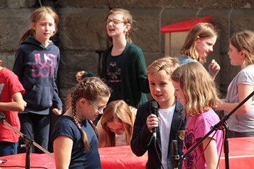 jeder aus Team Süd lautstark mitrappen. Damit die Kinder der anderen Teams bei so viel Schokolade nicht neidisch werden, gab es für jedes Kind eine Kostprobe von fair und ohne Kinderarbeit produzierter Schokolade. Denn eines ist klar, das Beste, was man mit Schokolade machen kann ist - essen!