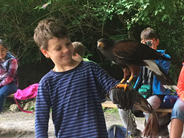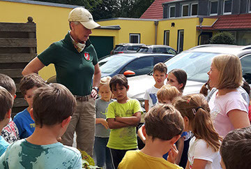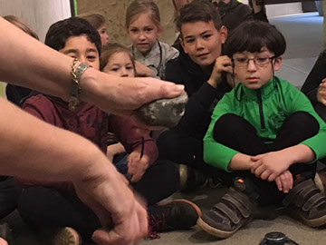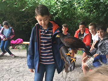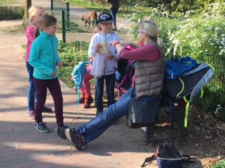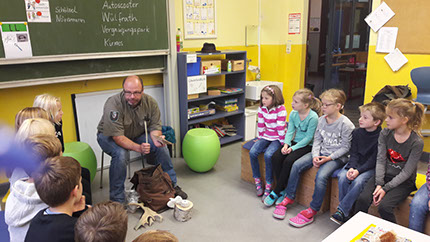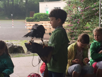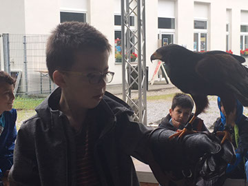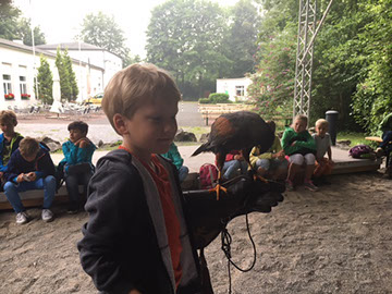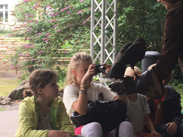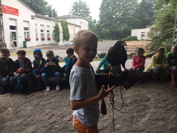 Zum Abschluss des Projektes Waldtiere besuchte das Team Nord die Wald-Forscher -Station am Zeittunnel. So hatten alle Igel, Hasen, Löwen und Mäuse die Gelegenheit, den Wüstenbussard Merlin, Uhu Uwe und die kleinen Eulen Elvis und Cilly aus nächster Nähe kennenzulernen.
