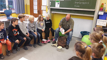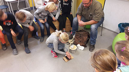 Am 18.09.2017 besuchte ein Schülervater – Herr Zobel – die Löwenklasse. Er konnte den Kindern viele Informationen darüber geben, wie die Steinzeitmenschen Feuer gemacht haben, Tiere erlegten, ihre Kleidung anfertigten usw. Dazu hatte er auch viele interessante Dinge mitgebracht: Feuersteine, Zündschwämme, Messersteine uvm. Vielen Dank, Herr Zobel! Das war sehr interessant!