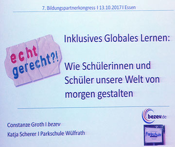 Gutes Morgen! Auf dem 7. Bildungspartnerkongress in Essen haben wir gemeinsam mit unserem Kooperationspartner bezev e. V. die Projekte Wasser – Schokolade – Spielzeug unserer Projektwoche „echt gerecht” vorgestellt. Außerdem konnten wir neue Ideen mitbringen, um weitere Inhalte Globalen Lernens im Sinne einer inklusiven Bildung für nachhaltige Entwicklung in unseren Schulalltag umzusetzen.