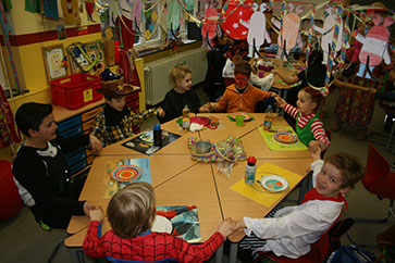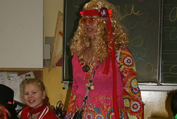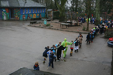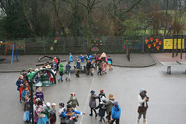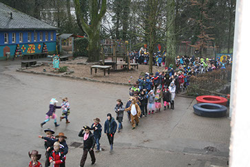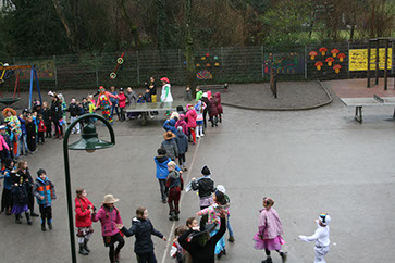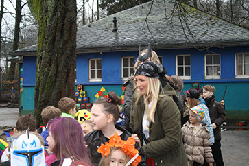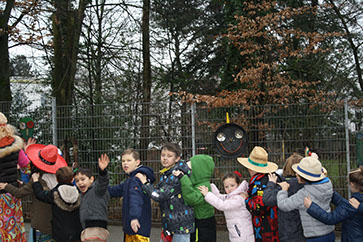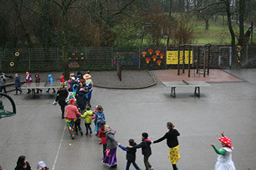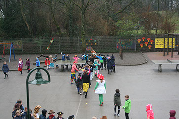 ihren Klassenräumen. Es wurde gespielt, gemalt und getanzt. Das „rote Pferd“ und „Astronaut” durften dabei natürlich auch nicht fehlen. Nach einem leckeren Karnevalsfrühstück fand dann die traditionelle Polonaise mit allen Kindern und Lehrern statt. Und danach wurde kräftig in der Sporthalle weitergefeiert. Sogar das Prinzenpaar mit seinem Gefolge hat