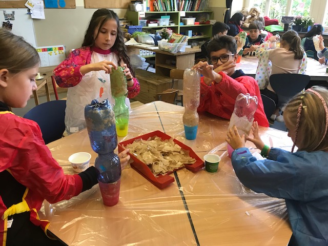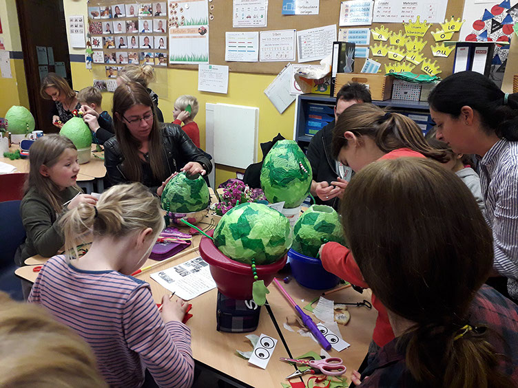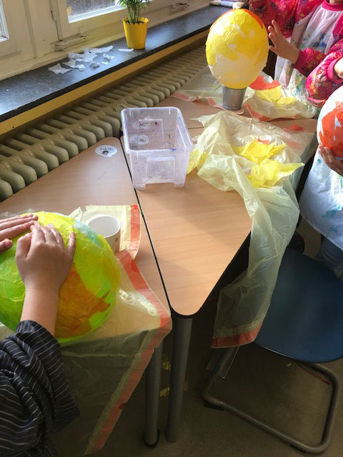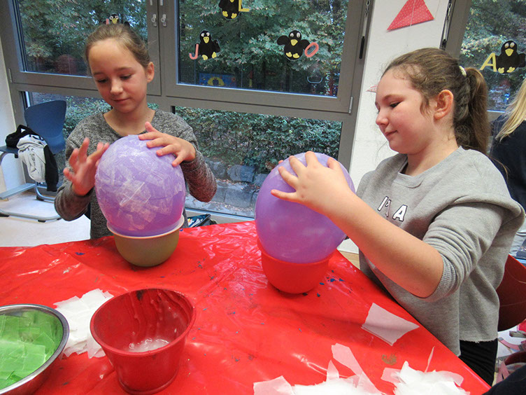 Passend zu dem Buch „Das kleine WIR“ gestalten die Kinder von Team Mitte ihre diesjährigen Laternen. Am kreativen Tag wurden die ersten Vorbereitungen für die Laternen getroffen. Aus vielen Luftballons, ganz viel Kleister und grünem Transparentpapier bastelten die Kinder viele kleine grüne Körper. Nach den Ferien geht es dann weiter: Arme, Beine, und das Gesicht lassen „Das kleine WIR“, das wir nach den Sommerferien bereits kennen gelernt haben, endlich Gestalt annehmen. Wir sind sehr gespannt und freuen uns schon auf einen tollen Bastelnachmittag.