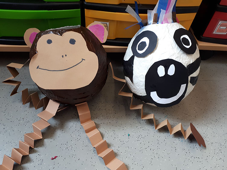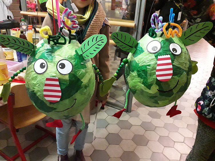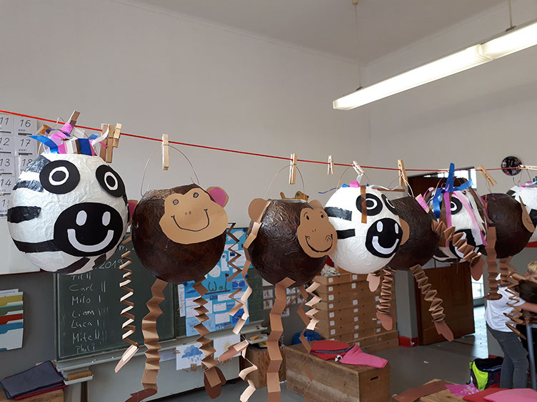 Passend zum Zoobesuch bastelten die Kinder von Team Süd an ihrem kreativen Tag in der letzten Woche Affen- und Zebralaternen. Es wurde fleißig Transparentpapier gerissen und gekleistert. Nachdem der Kleister getrocknet war, bekamen die Affen noch lange Arme und lustige Gesichter und die Zebras coole Frisuren. Jetzt sehen alle Laternen richtig toll aus und warten auf Sankt Martin!