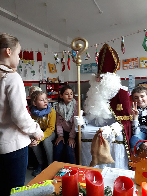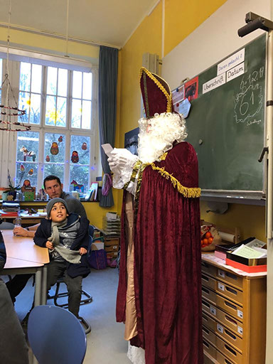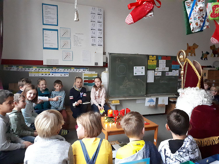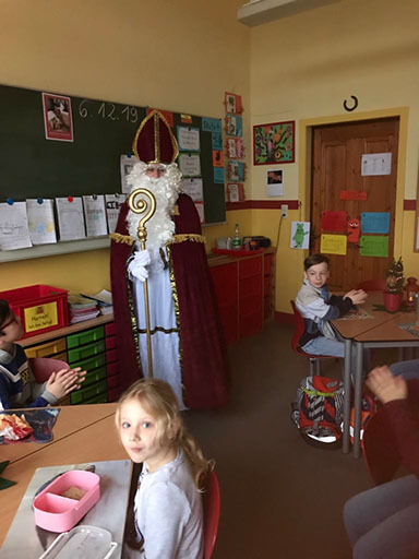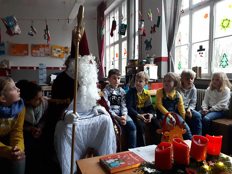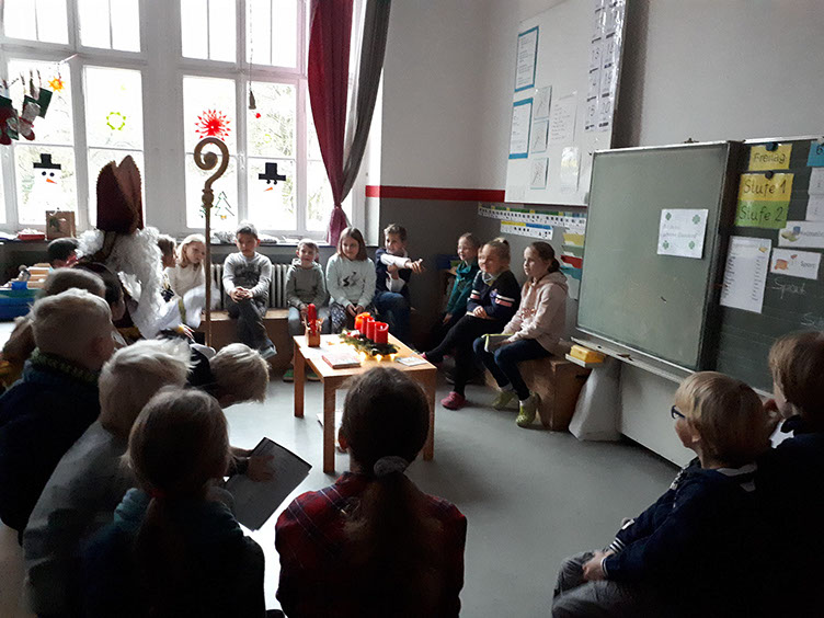Ganz gespannt war die Stimmung am Freitagmorgen in allen Lerngruppen. Es ging das Gerücht um, dass der Nikolaus auch in die Parkschule kommen würde. Einige Kinder meinten seine Rentiere gesehen zu haben und andere den Esel auf dem er her geritten ist. Als er dann in der Tür stand, war diese Diskussion vergessen. Nach dem ersten Staunen trauten sich die Kinder ihre Gedichte und Lieder vorzutragen und auch noch einige Fragen zu stellen. Am Ende bekam jedes Kind noch etwas aus dem Nikolaussack und jede Klasse zwei USB-Sticks, auf denen die Kinder Geschichten, Briefe und Artikel speichern und weiterreichen können.