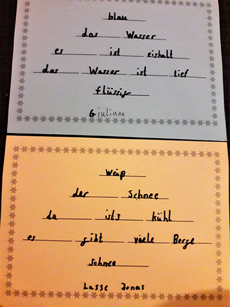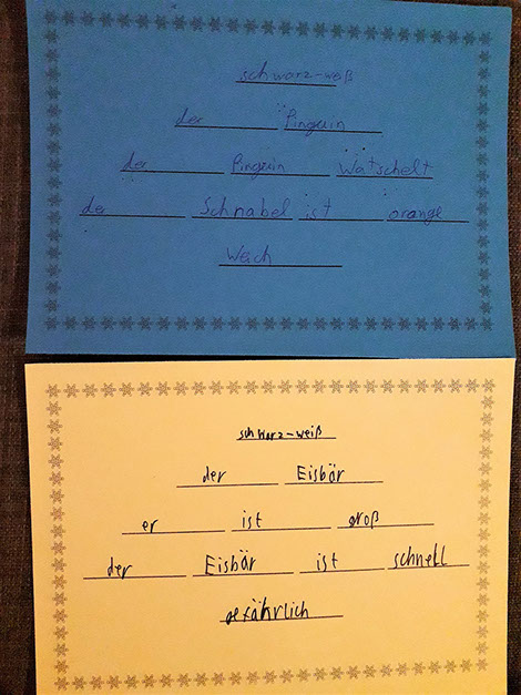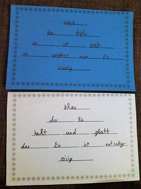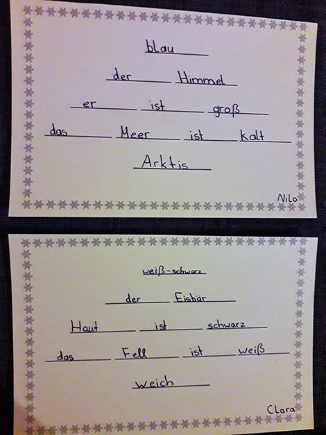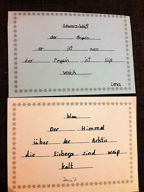 Die Raben haben gerade das Thema Arktis. Dazu wurden auch Elfchen in Partnerarbeit oder alleine geschrieben. Elfchen sind Gedichte, bei denen elf Wörter in besonderer Form angeordnet sind. Zuerst schreibt man mit einem Wort eine Farbe in die erste Zeile. In der zweiten Zeile stehen dann zwei Wörter. Da beschreibt man, über was man schreibt (zum Beispiel die Arktis, der Himmel, der Eisbär). In der dritten Zeile schreibt man mit drei Wörtern, was es tut oder wie es ist. In der vierten Zeile hat man nochmal vier Wörter Platz, noch mehr über das gewählte Wort zu schreiben. Als letztes kommt ein Wort, das alles umfasst. Elfchen schreiben hat uns gut gefallen.