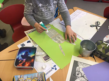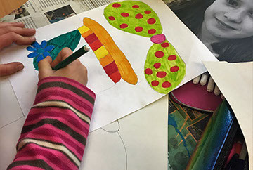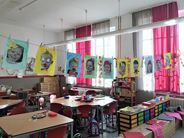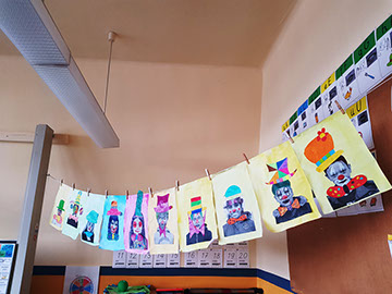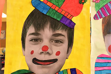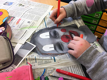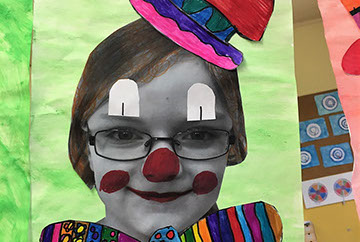 Das eigene Gesicht als schwarz-weiß-Foto wurde mit Filzstiften „geschminkt“ und mit einer bunten Fliege und einem lustigen Hut verziert. Tolle Werke sind entstanden und die Stimmung bei der Arbeit war ziemlich lustig!