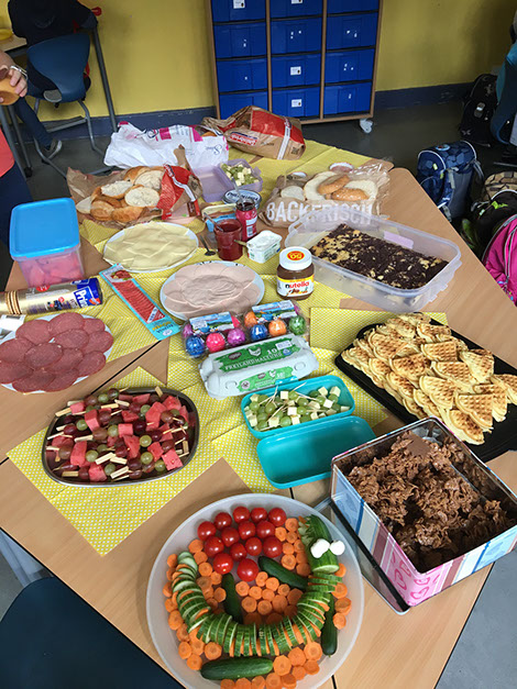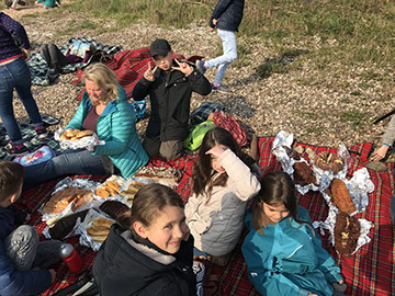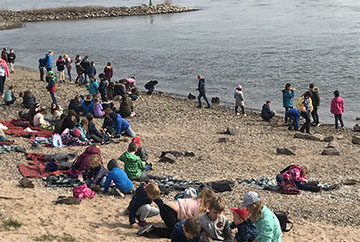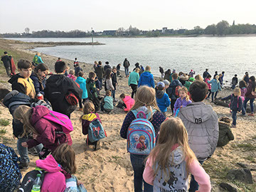 Dienstag ging es zum Rhein. Hier wurden Muscheln und tolle Steine gesammelt. Beim Flitschen der Steine gab es viele Profis. Am Wasser hatten wir auch ein Picknick mit einem reichhaltigen Kuchenbuffet. Das war so lecker!