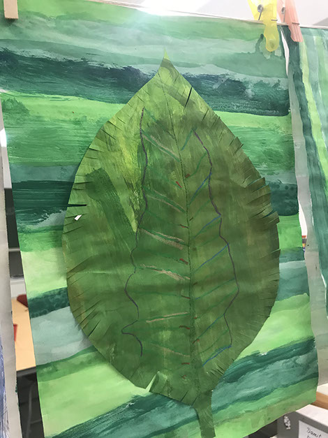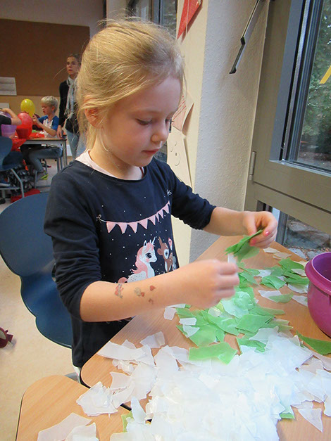Team Nord hat mit dem Farbkasten alle möglichen Grüntöne ausprobiert. Das Mischen und Ausprobieren hat allen Kindern viel Spaß gemacht. Zuletzt wurden Blätter in vielen verschiedenen Formen ausgeschnitten.