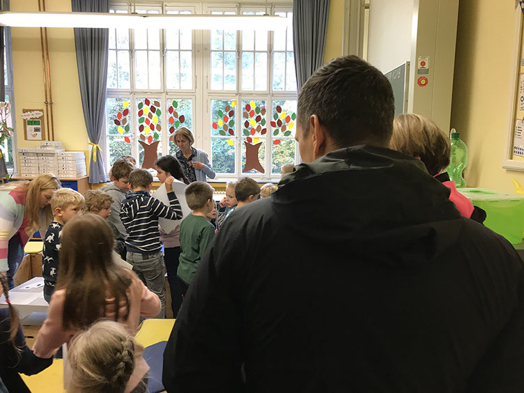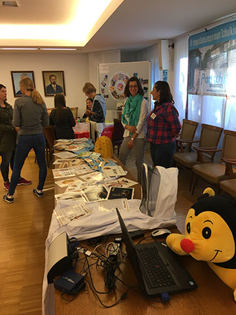 Im großen Saal des Rathauses fand die zweite Messe „Vom Kindergarten in die Schule” statt. Die Besucher konnten sich über die verschiedenen Schulkonzepte der Grundschulen informieren, Fragen zum Offenen Ganztag stellen und beteiligte Institutionen, wie Beratungsangebote, Ergotherapie, Logopädie und Vereine kennenlernen. Rund um den Parkschulstand war viel zu tun! Neben den vielen Fragen zu unserem jahrgangsgemischten Lernen und den Betreuungsangeboten in der Ogata, konnten die Kinder bei uns auch noch Bienen- und Kleeblattkekse mit Lebensmittelfarbe bemalen und auch gleich essen! Oder sie konnten Fingerabdrücke in Bienenform machen, während ihre Eltern im Material zum Thema „Bienen” stöberten. Es war eine gelungene Veranstaltung, auf der wir rund 300 Besucher begrüßen durften! Wir freuen uns schon darauf, das ein oder andere Gesicht am 09. Oktober zum Infoabend oder am 11. Oktober zum „Tag der offenen Tür” wiederzusehen!