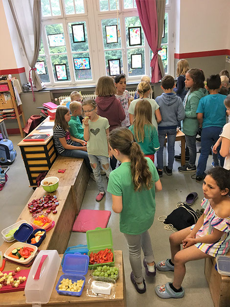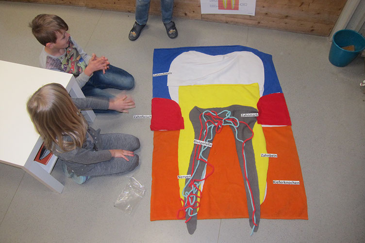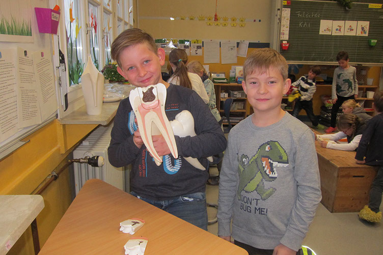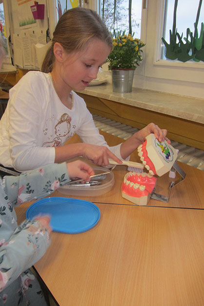 Nachdem in jeder Lerngruppe noch einmal gemeinsam das richtige Zähneputzen geübt wurde, hatten die Kinder die Möglichkeit, selbständig an verschiedenen Stationen mehr über unsere Zähne, die Entstehung und Bekämpfung von Karies sowie über gesunde Ernährung zu erfahren.
