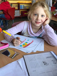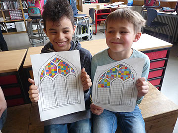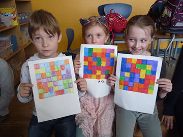 Team Süd hat seinen kreativen Tag im April ganz dem Zufallsprinzip überlassen. Hierfür haben wir uns ein Foto des 113 Quadratmeter großen Kirchenfensters im Kölner Dom angeschaut, das von Gerhart Richter 2006 aus 11.500 mundgeblasenen Echt-Antik-Glas-Quadraten gestaltet wurde. Die Anordnung der einzelnen Farbflächen wurde mittels eines Zufallsgenerators erstellt. Der Zufallsgenerator der Füchse, Frösche, Katzen und Hunde war ein Würfel. Für jede Zahl von 1 bis 6 suchten die Kinder sich eine Farbe aus. Nachdem sie ausgerechnet hatten, dass das Originalfenster die Größe von ungefähr drei Klassenräumen hat, begannen sie fleißig zu würfeln und zu malen. So entstanden wunderschöne, ganz individuelle leuchtend bunte Kirchenfensterbilder.