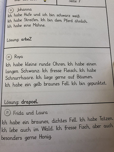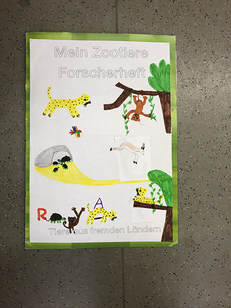 Als erstes haben wir ein Heft bekommen, in dem wir das ganze Thema Zoo bearbeitet haben. Wie zum Beispiel: In welchen Gebieten leben die verschiedenen Tiere? Was sind die Aufgaben eines Zoowärters? Was ist ein Zoo? Welche Zoos gibt es? Und wir haben einen Steckbrief zu einem Zootier geschrieben, das wir uns selbst aussuchen durften. Im Englischunterricht haben wir das Thema Zoo auch ausführlich durchgenommen. Wir haben das Lied „Let`s Go on Safari“ gesungen, was die Tiere fressen und wie die Tiere auf Englisch heißen. Zwei Schülerinnen aus der vierten Klasse haben ein englisches Domino gespielt. Außerdem haben wir im Deutschunterricht angefangen das Bilderbuch „Gute Nacht Gorilla“ zu lesen. Die 2er, 3er und 4er Kinder mussten eine Fortsetzung schreiben. Die 1er haben ihre Geschichte auf einen Easyspeak gesprochen. Die 3er und 4er mussten ihre überarbeitete Geschichte auf dem Computer abtippen und dann per E-Mail an unsere Lehrerin schicken. Wir haben auch ein „Elefanten-Zoo-Rätselbuch-Wer bin ich?“ erstellt. Jedes Kind hat alleine oder mit einem Partner ein „Wer bin Ich?“- Rätsel geschrieben. Dieses haben wir im Kreis vorgelesen und gemeinsam gelöst. Aus diesen Rätseln haben wir dann ein Buch gemacht. Dabei haben wir richtig viel Spaß gehabt. Wir Elefantenkinder waren nicht so faul wie das Faultier im Wuppertaler Zoo. Von Emilio, Johanna, Max, Maxi, Nina, Roya, Semi,