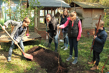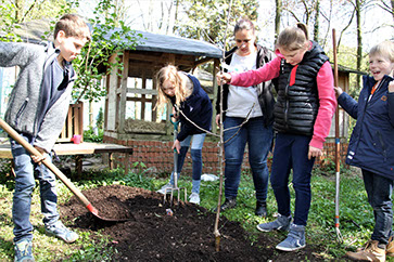 In dieser Woche konnte die Garten AG einen Apfelbaum pflanzen, der aus der der Aktion „Pflanze Deinen Baum‟ der WDR Sendung „Hier und Heute‟ stammt. Bäume werden gepflanzt, um Insekten, vor allem aber Bienen, eine Nahrungsquelle zu bieten. Unsere Bienen werden sich sehr freuen, da unser Volk in der Schule stetig wächst und nun schon einen Brutraum mehr bekommen hat. Vielleicht können wir Ende des Jahres auch schon die ersten Äpfel ernten?