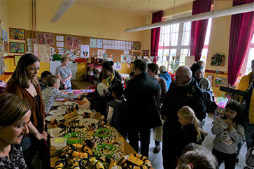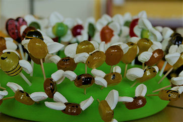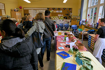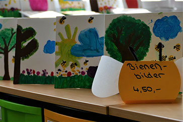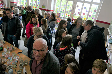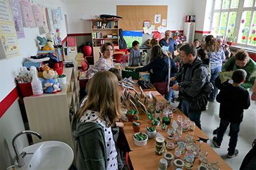 Obwohl es draußen recht frisch war, konnte man am Freitag in der Parkschule den Frühling an allen Ecken und Enden entdecken. Das Frühlingsfest lockte viele Besucher an und war mit fröhlicher Stimmung, kreativen Arbeitsergebnissen aus der Projektwoche und allerlei Leckereien ein toller Erfolg. In den Räumen der Lerngruppen wurden unter anderem Kerzenhalter, Bilder, Tassen, Teller, Ohrringe, Schilder, Tragetaschen, Kissen, Bienenkekse, Türkränze, Dekozweige und Blumenvasen verkauft. Alles wurde in der Projektwoche selbst hergestellt von vielen fleißigen Händen. „Die Vielfalt ist toll“, sagten einige Besucher und zeigten begeistert, was sie sich ausgesucht hatten. Andere erzählten, dass sie noch schnell etwas Geld besorgen müssten, weil sie nicht damit gerechnet hatten, so viele schöne Dinge kaufen zu können. Die Kinder zeigten nicht nur den Eltern, sondern auch Omas, Opas, Tanten und Onkeln oder Freunden die ganze Schule und natürlich besonders ihre Kunstwerke. Auch andere Freunde der Parkschule kamen zu Besuch, darunter einige ehemalige Kolleginnen. Sogar die Parkschulbienen konnten bewundert werden. In einem Glasschaukasten standen einige von ihnen in der Hundeklasse. Wer genug geschaut hatte, konnte Würstchen oder Kuchen essen und Kaffee trinken. Außerdem gab es frisch zubereitete Smoothies und herrlich duftendes Popcorn. Wir bedanken uns herzlich bei allen, die mit Kuchenspenden, Grill- und Aufbaudiensten, Smoothiezubereitung usw. geholfen haben, dass unser Frühlingsfest so gut gelungen ist!
