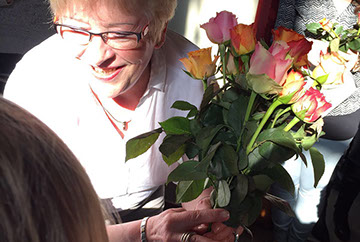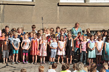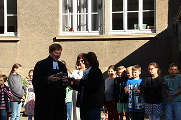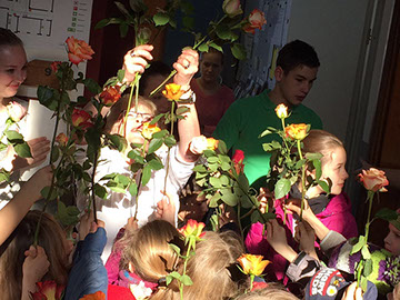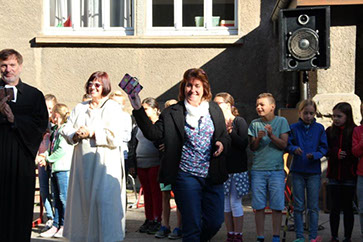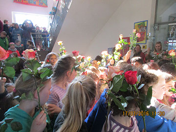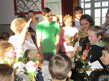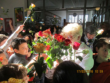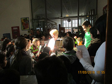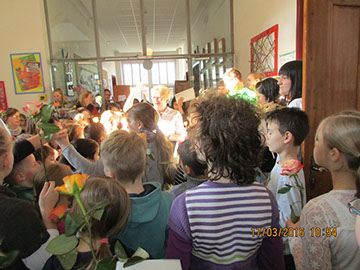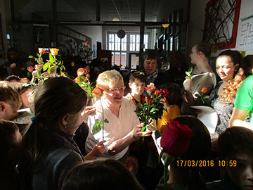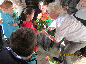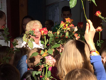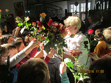 Wir sagen dir Tschüss und winken dabei und wünschen dir viel Glück! Nach 17 Jahren wurde heute unsere Sekretärin Gerda Greverath in den Ruhestand verabschiedet. Schon gestern wurde die Verabschiedung im Rahmen einer Radiosendung der Radio AG eingeleitet. Heute versammelten sich alle Kinder, Lehrer und Mitarbeiter der Parkschule im Treppenhaus. Die Schulsprecher Hannah und Moritz sagten ein Gedicht auf. Anschließend sangen alle ein Abschiedslied. Und dann verabschiedete sich jeder einzeln mit einer Rose bei Frau Greverath. Einige Schüler bastelten kleine Geschenke. Am späten Nachmittag lud Frau Greverath zu einer Abschiedsfeier in die Ogata ein.