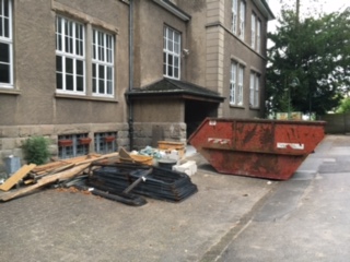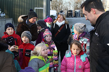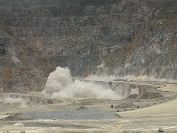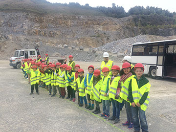 Dann haben wir unsere Ausrüstung bekommen: Helm, Schutzbrille und Warnweste gehören dazu. Danach sind wir in den Steinbruch gefahren. Wir waren sehr aufgeregt! Dann konnten wir endlich in den Steinbruch gucken und dann kam uns ein SKW entgegen, der mit Kalkstein voll war. Er konnte 95 Tonnen tragen. Danach haben wir eine Sprengung gesehen. Das war richtig cool als das in sich zusammenbrach. Das war sehr schön. Und dann haben wir noch eine Sprengung gesehen. (Lea und Lasse)