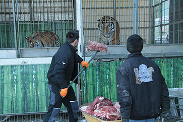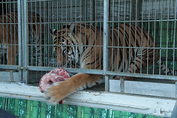 Frau Volmer und der Besitzer der Tiere, Tom Dieck, erklärten den Kindern alles rund um die großen Raubkatzen und beantworteten fleißig alle Fragen, während die Löwen und Tiger ihre Fleischportionen verspeisten.