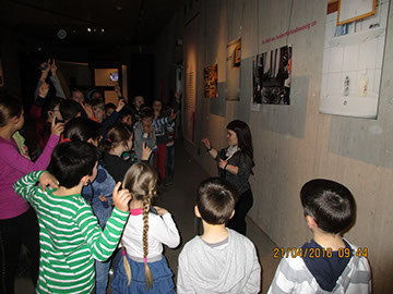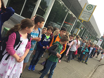 Wir sind zuerst ganz lange mit dem Bus gefahren. Später sind wir angekommen und mussten einen Moment warten, dann konnten wir rein. Wir sind runtergegangen und haben unsere Jacken und Rucksäcke in eine große Kiste gepackt. Wir haben Kopfhörer bekommen und sind dann endlich in die Ausstellung gegangen.