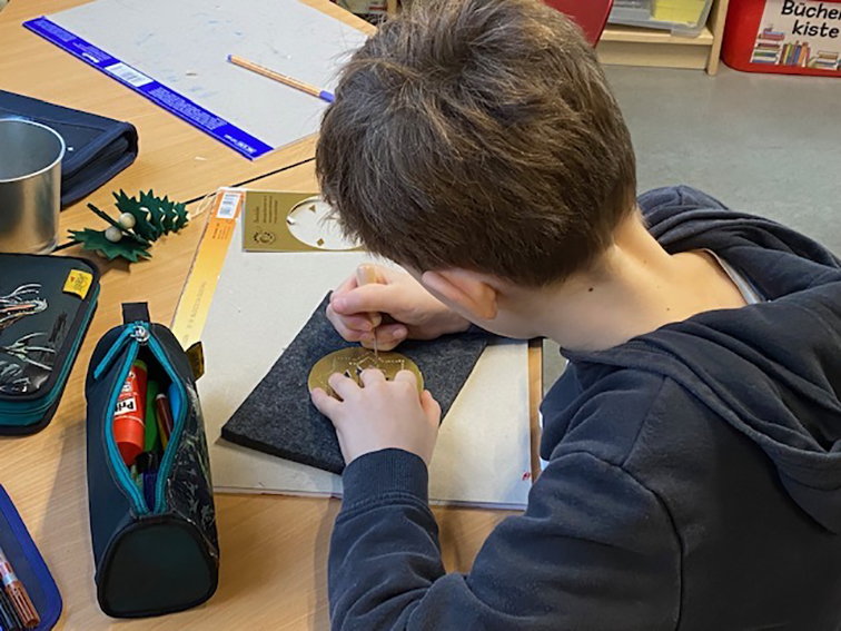 gearbeitet. Hier wurden goldene Sterntaler geprickelt, da Tannenbäume und
